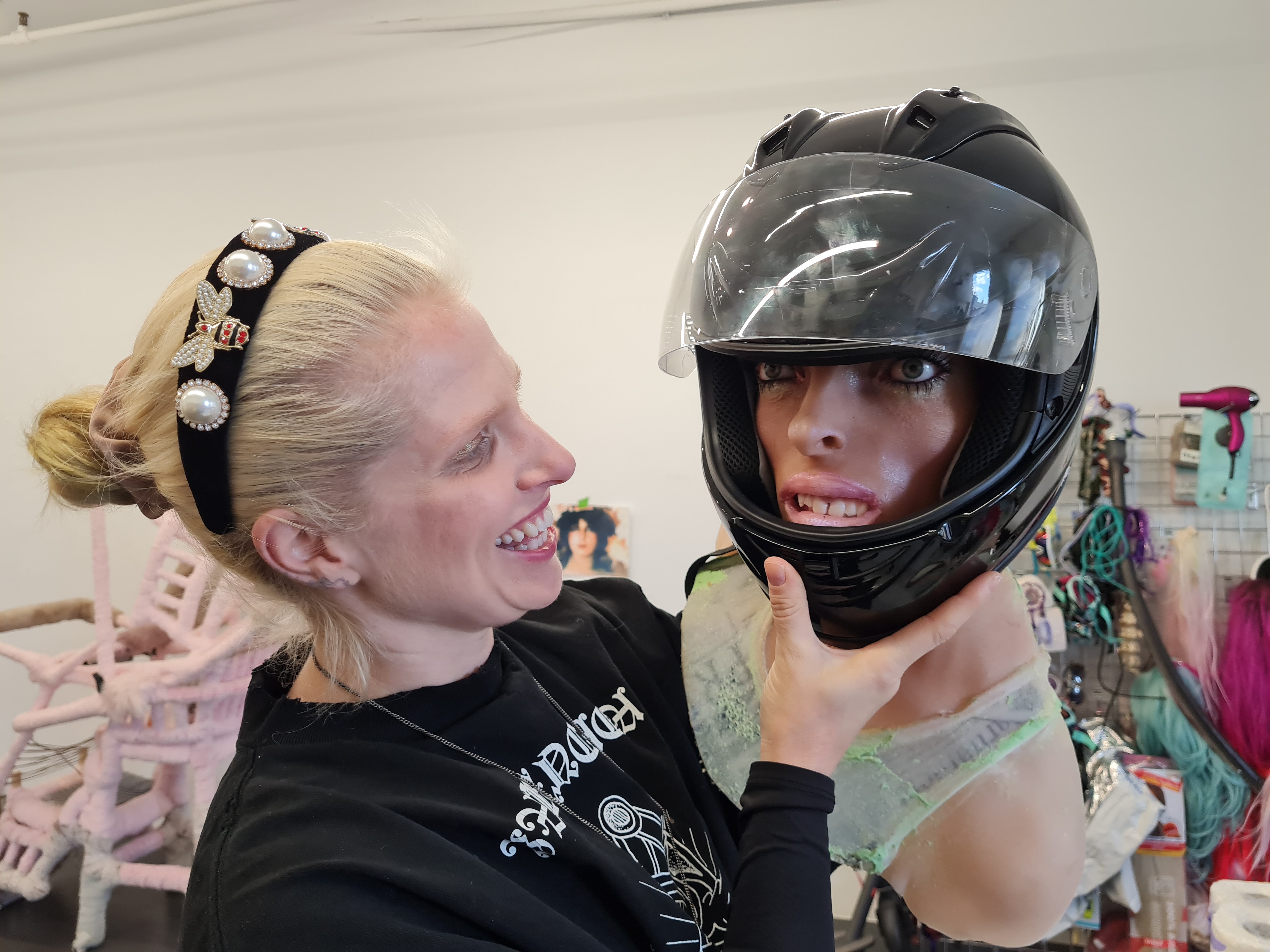 Ich liebe es, bei Target und in anderen großen Kaufhäusern zu shoppen. Als ich vor ein paar Jahren in London Soho ausgestellt habe, habe ich dort die vielen Sexshops rauf und runter durchstöbert. Seitdem verarbeite ich in meinen Arbeiten Vibratoren und anderes Sexspielzeug, gerne auch Küchenutensilien. Manchmal inspiziere ich während der Arbeit an einer Skulptur meine Regale und suche nach einem Farbthema, kombiniere eine Sonnenbrille mit einer Lampe, einem Massagegerät, einer Perücke und so weiter. Ich kaufe gerne Sportgeräte oder Zubehör für Aquarien oder für Pferde. Manchmal denke ich, oh, was haben wir denn hier, wofür ist dieses Ding? Das finde ich lustig. Ich versuche immer, im Atelier Spaß zu haben. Das war nicht immer so.