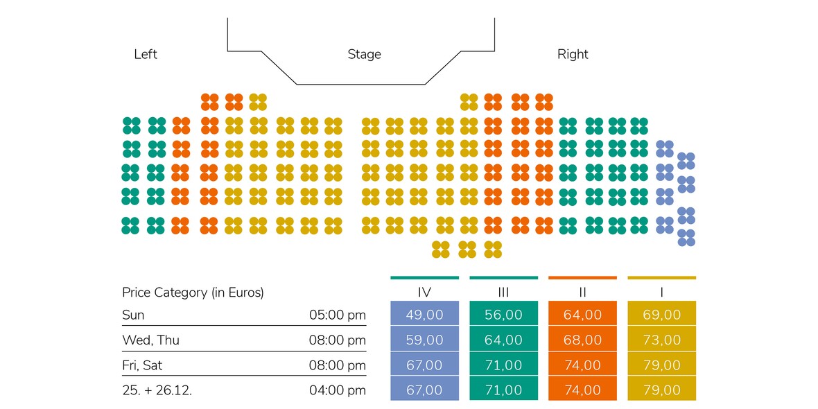You can pick up your reserved tickets at any time during the regular opening times of the "Stars in Concert" ticket counter, but no later than 30 minutes before the show begins on the day of the performance.
