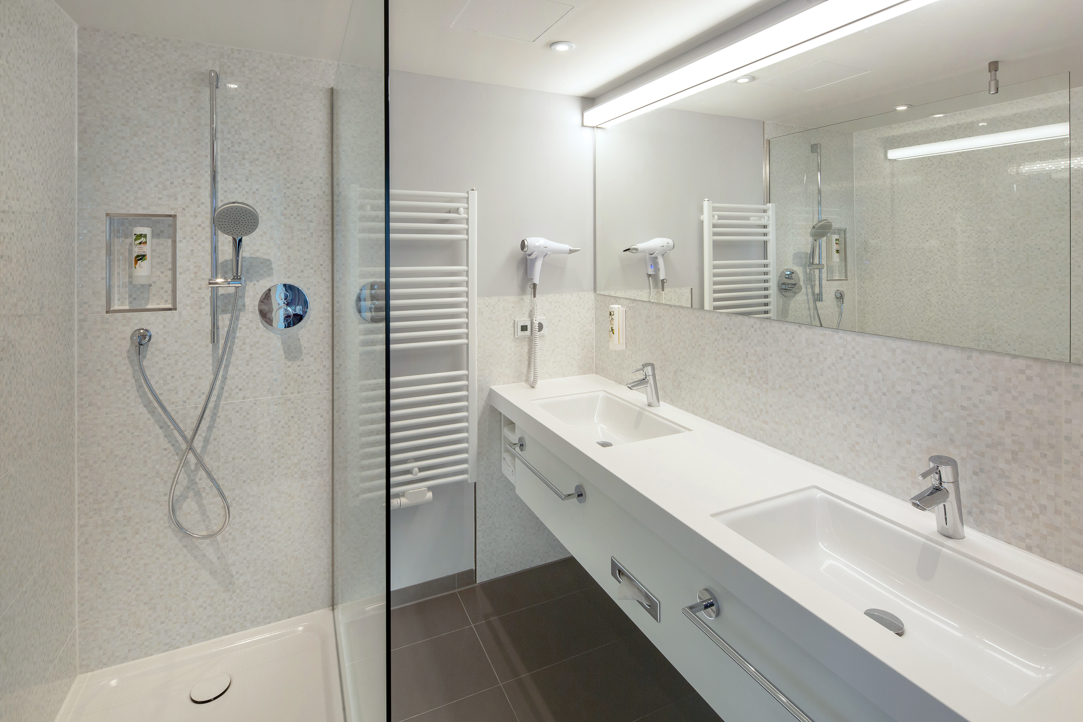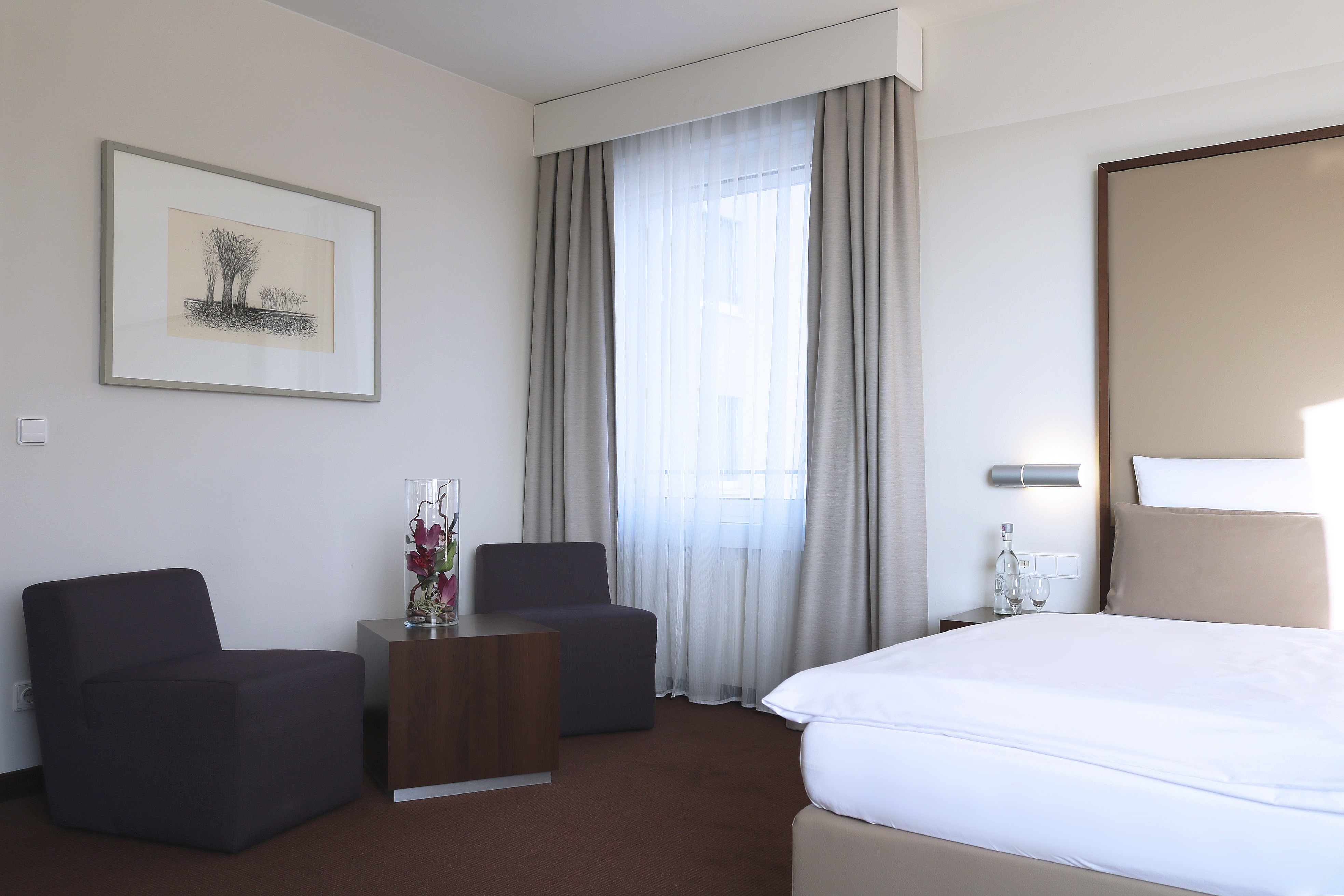 The 27 sqm standard rooms offer 4-star plus living comfort. Their contemporary design makes use of light natural tones that create a welcoming atmosphere.The rooms are additionally equipped with modern furnishings and spacious working & storage areas so as to best meet guests' needs.